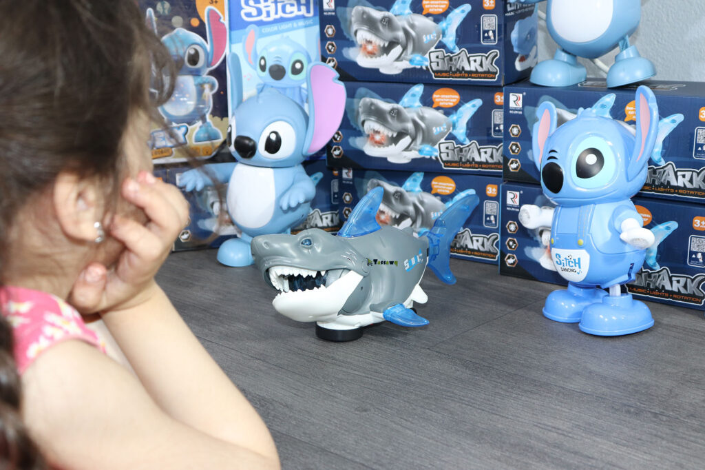 تضيء عيون القرش، وتتحرك للأمام والخلف، يمينًا ويسارًا بشكل واقعي، ويتحرك ذيله بنفس الطريقة. و موسيقى بيبي شارك و اضواء مع تحريك الزعانف و الذيل
