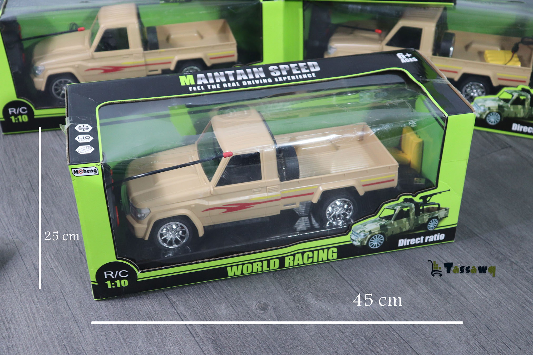 حجم كبير قد وليدك في الطول 45 سم (حجم العبوة ) حجم السيارة 33 سم و زيد روشارجابل و يشعلو الاضواء و تحكم عن بعد بعيد المدى