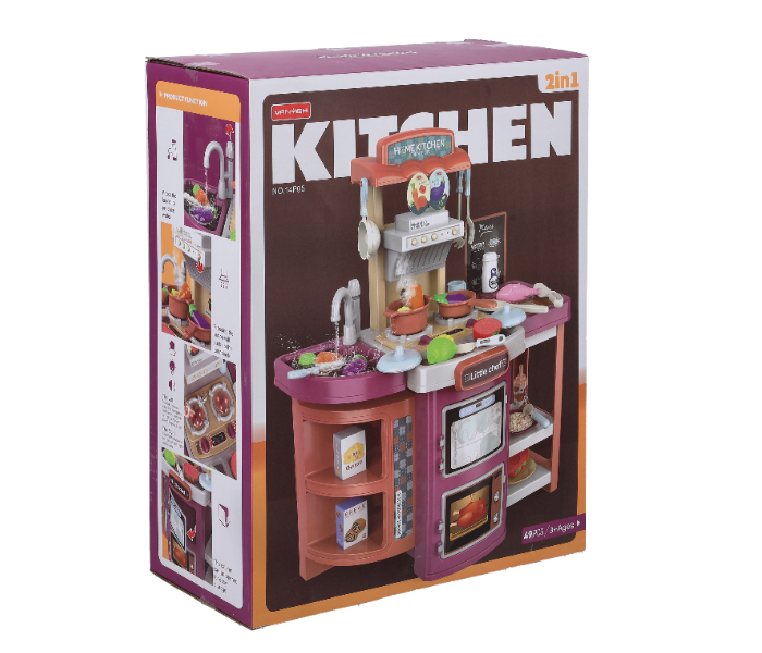 تأتي مع موقد لعب، أدوات طبخ، بخاخ ماء، طاولة حلوى دوارة، حوض غسيل يعمل بالماء، ومجموعة متنوعة من ملحقات المطبخ.